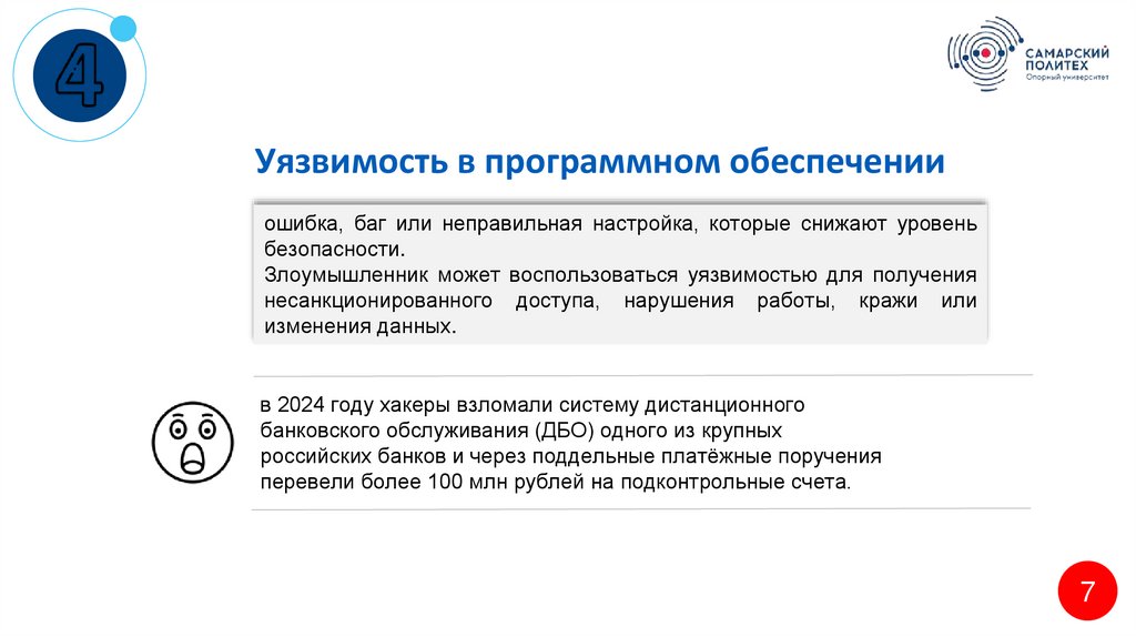 Уязвимость в программном обеспеченииошибка, баг или неправильная настройка, которые снижают уровень
