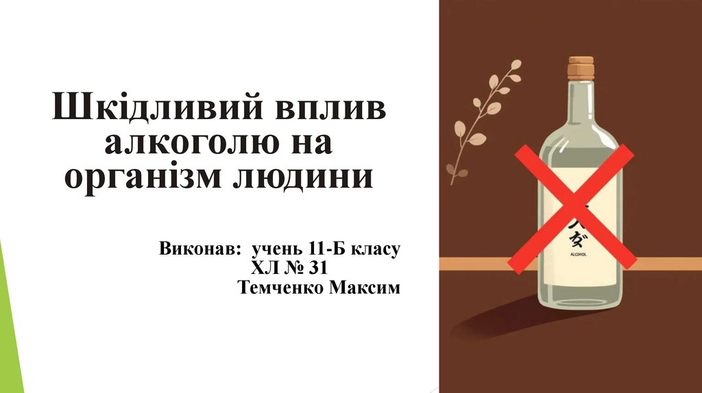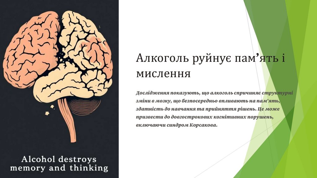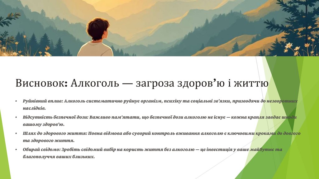Висновок: Алкоголь — загроза здоров’ю і життюРуйнівний вплив: Алкоголь систематично руйнує організм, психіку та соціальні зв’язки, призводячи до незворотних