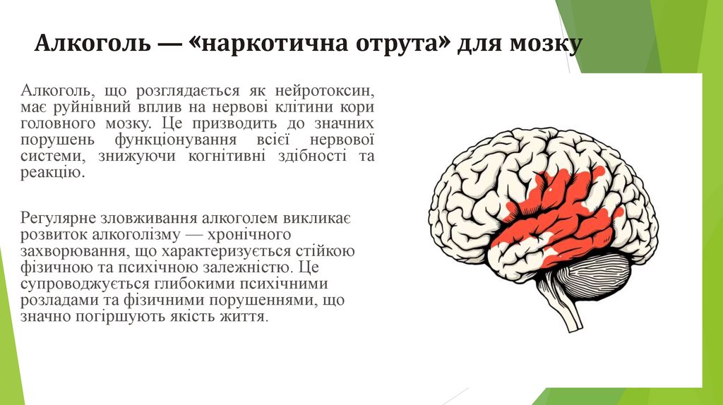 Алкоголь — «наркотична отрута» для мозкуАлкоголь, що розглядається як нейротоксин,