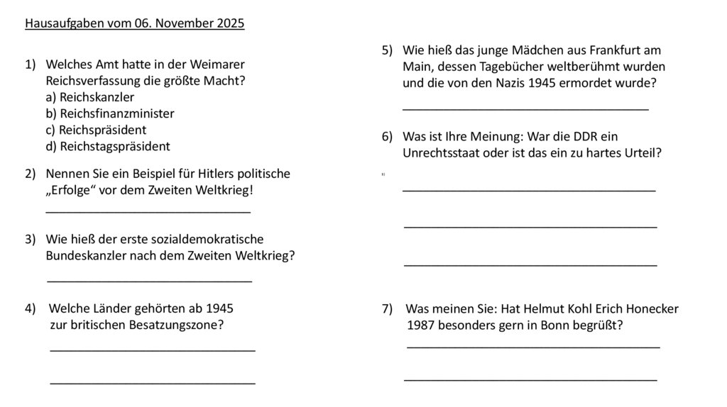 Hausaufgaben vom 06. November 20251) Welches Amt hatte in der Weimarer