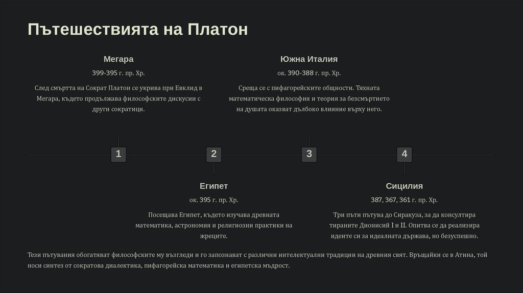 След смъртта на учителя си Платон напуска Атина за около десет години. Решава