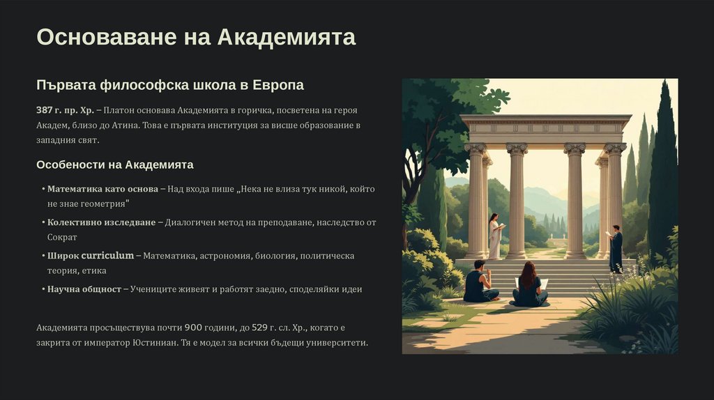 Основаване на АкадемиятаПървата философска школа в Европа