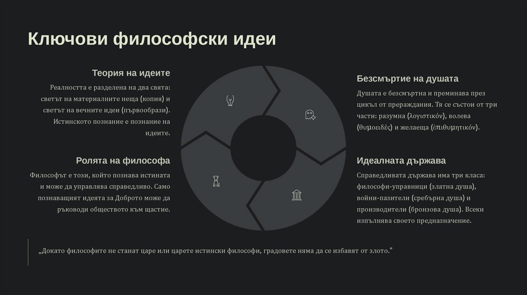 „Докато философите не станат царе или царете истински философи, градовете няма да се избавят от злото."