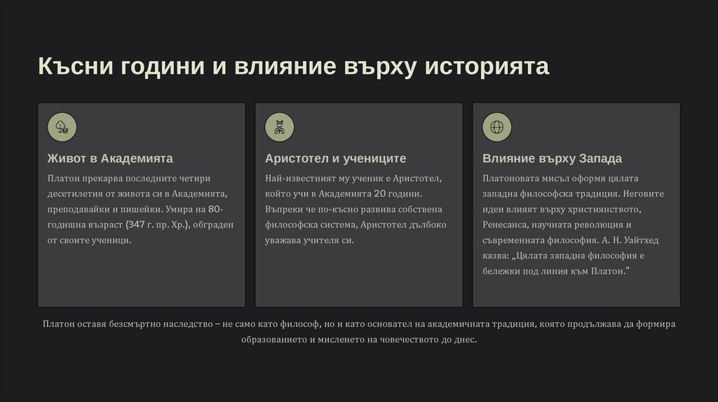 Платон оставя безсмъртно наследство – не само като философ, но и като основател на академичната традиция, която продължава да формира