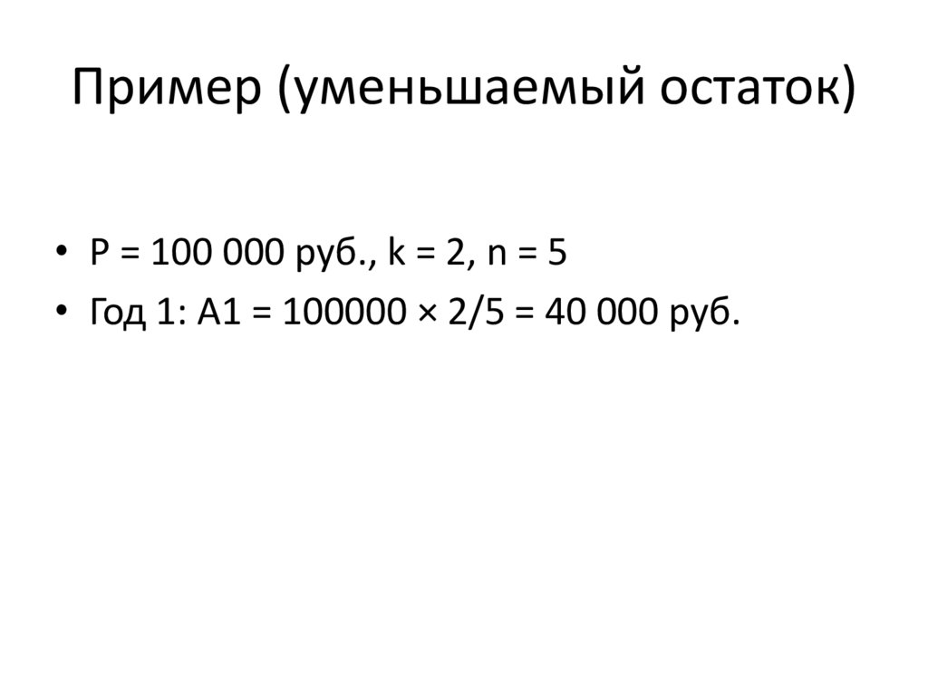 Пример (уменьшаемый остаток)• P = 100 000 руб., k = 2, n = 5
