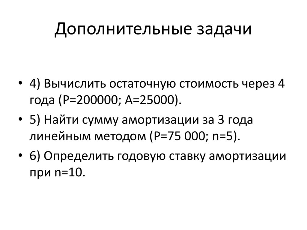 Дополнительные задачи• 4) Вычислить остаточную стоимость через 4