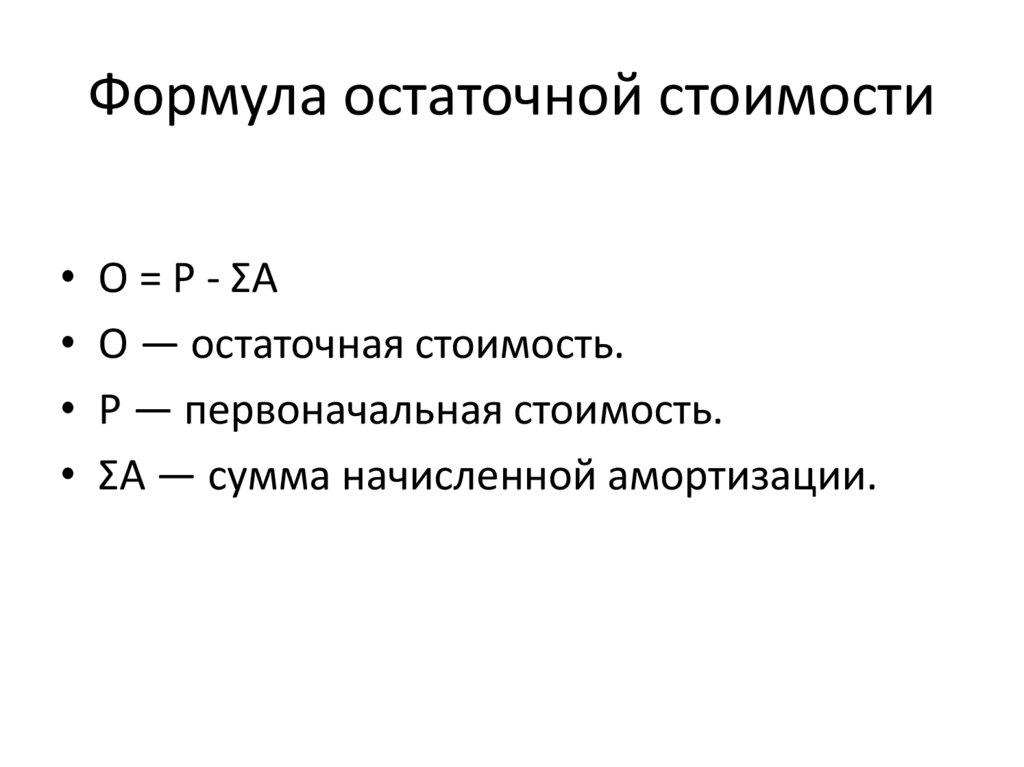 Формула остаточной стоимости• O = P - ΣA