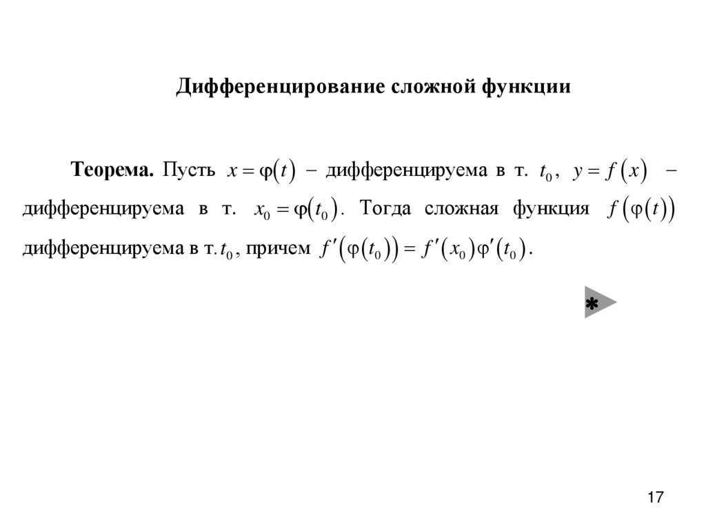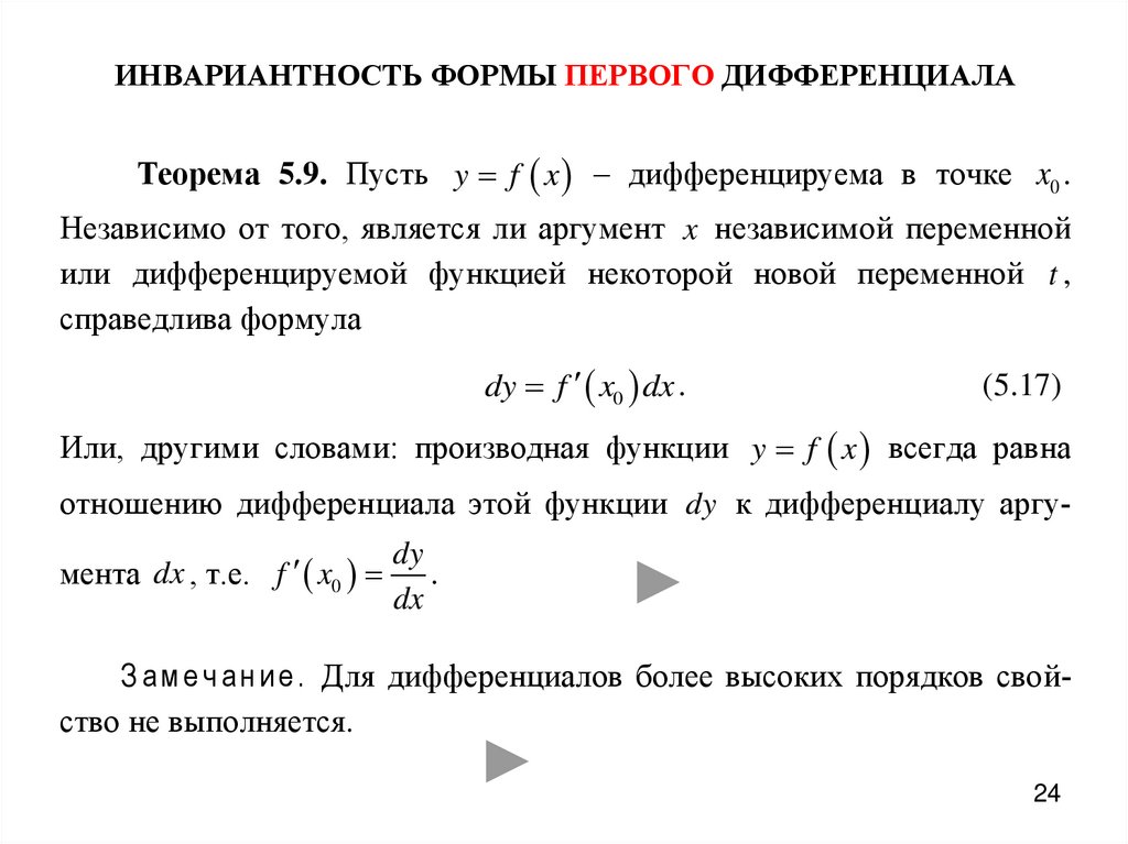ИНВАРИАНТНОСТЬ ФОРМЫ ПЕРВОГО ДИФФЕРЕНЦИАЛАТеорема 5.9. Пусть y f x – дифференцируема в точке x0 .