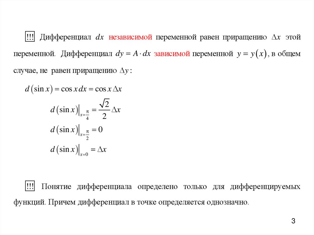 !!! Дифференциал dx независимой переменной равен приращению x этойпеременной. Дифференциал dy A dx зависимой переменной y y x , в общем