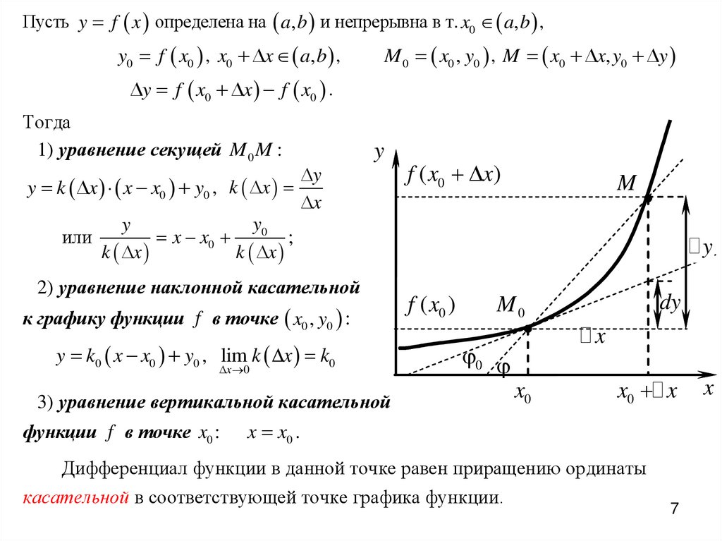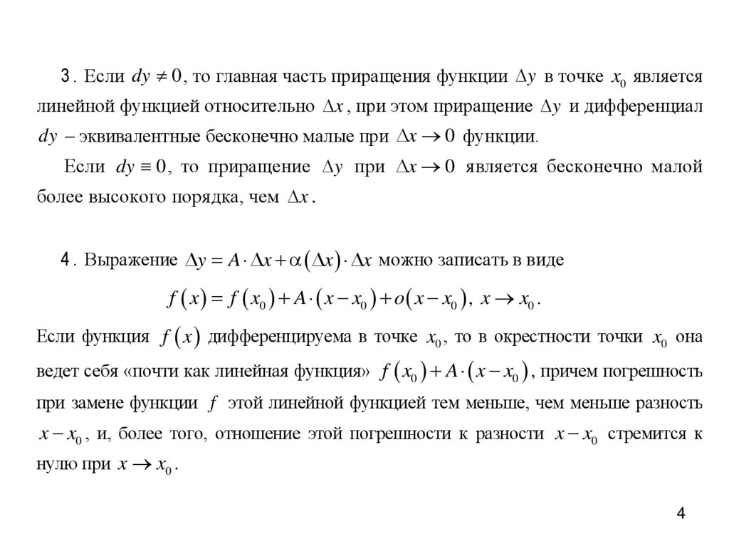 3 . Если dy 0 , то главная часть приращения функции y в точке x0 являетсялинейной функцией относительно x , при этом приращение y и дифференциал