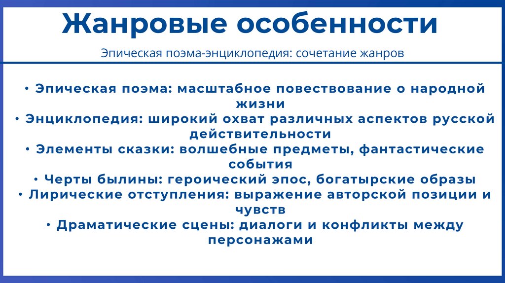 Жанровые особенностиЭпическая поэма-энциклопедия: сочетание жанров