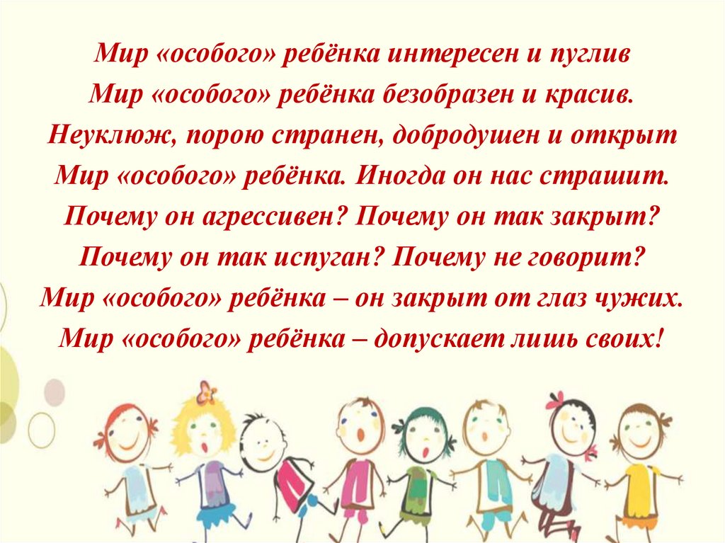 Мир «особого» ребёнка интересен и пугливМир «особого» ребёнка безобразен и красив.