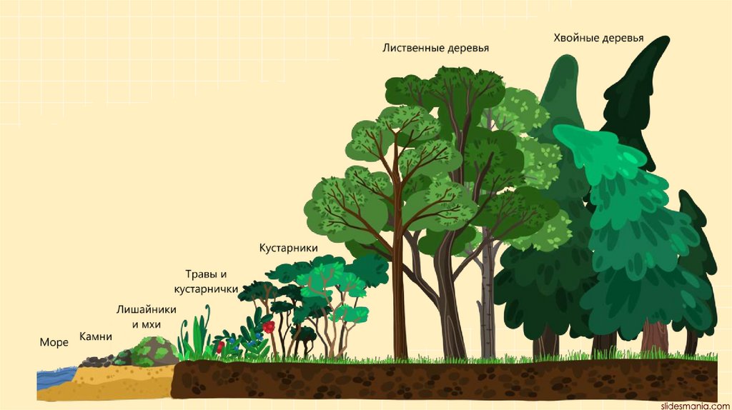 Первоначально в обоих случаях развивается травянистая растительность, формирующая почвенный покров.