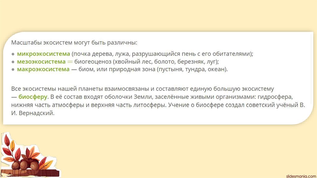 Экосистема (биогеоценоз) – это любое сообщество живыхсуществ вместе с его физической средой обитания,