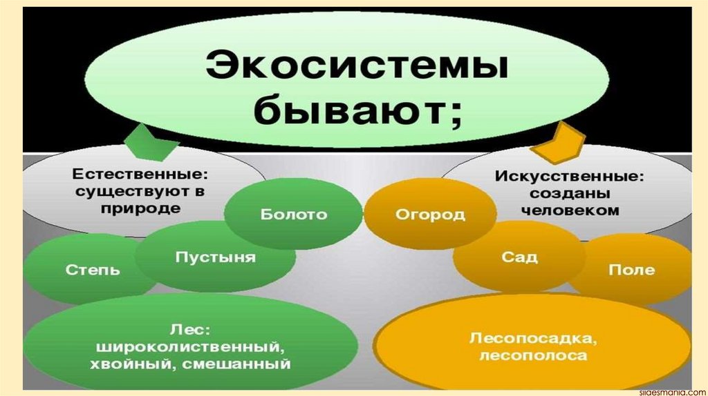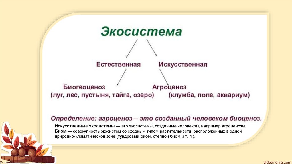 Искусственные экосистемы — это экосистемы, созданные человеком, например агроценозы.Биом — совокупность экосистем со сходным типом растительности, расположенных в одной