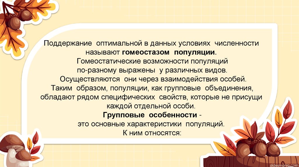Поддержание оптимальной в данных условиях численностиназывают гомеостазом популяции.