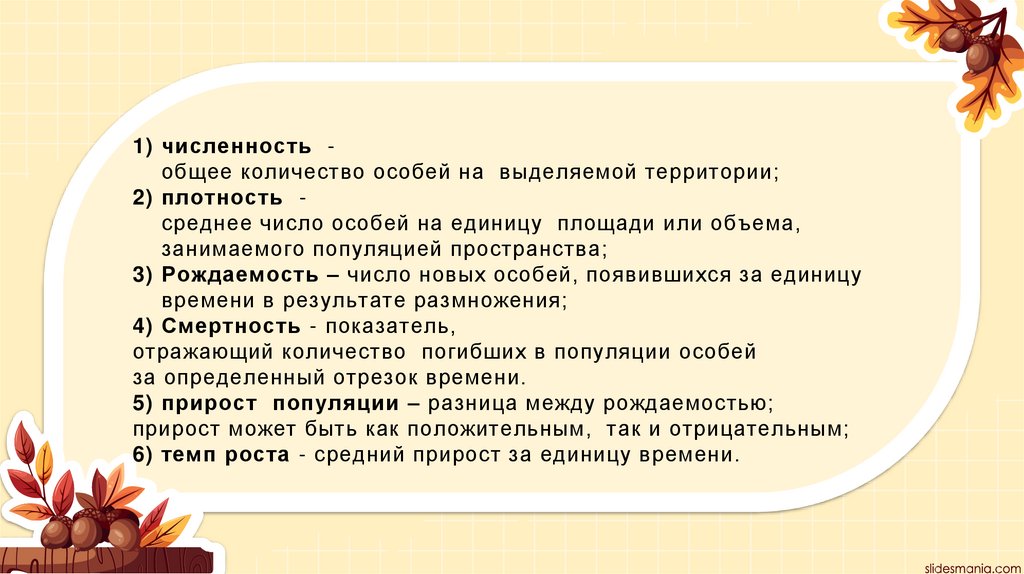 1) численность общее количество особей на выделяемой территории;2) плотность среднее число особей на единицу площади или объема,