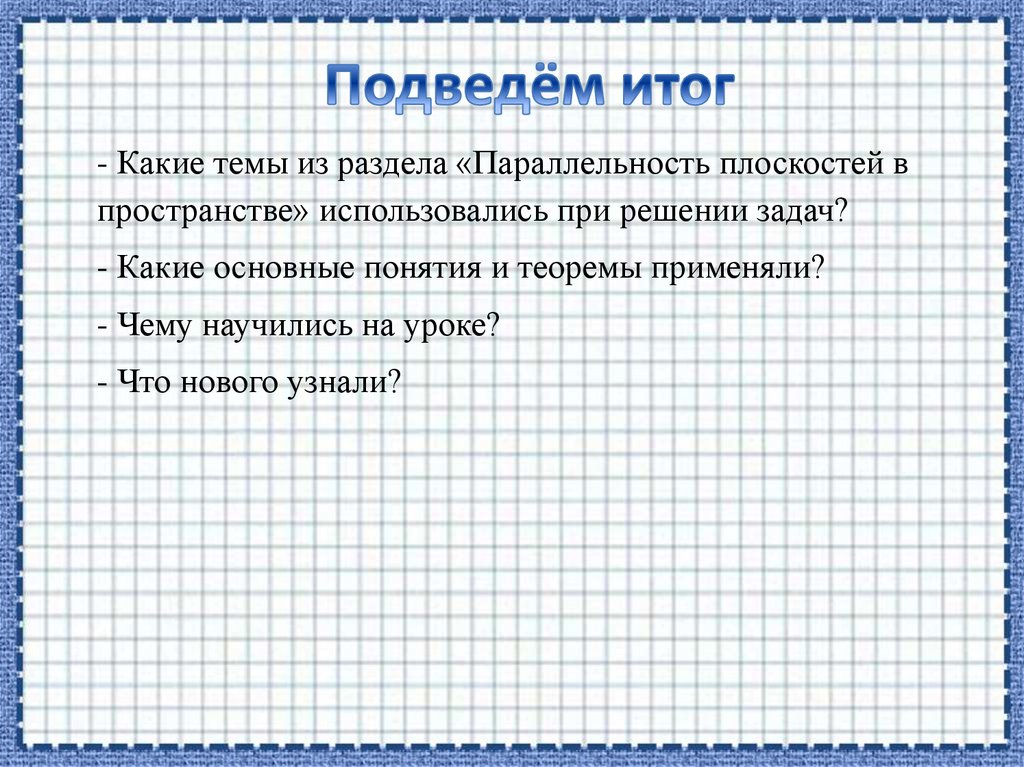 - Какие темы из раздела «Параллельность плоскостей впространстве» использовались при решении задач?