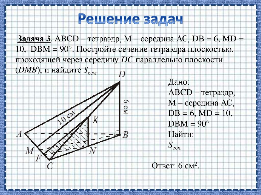 Задача 3. ABCD – тетраэдр, М – середина АС, DB = 6, MD =10, DBM = 90°. Постройте сечение тетраэдра плоскостью,