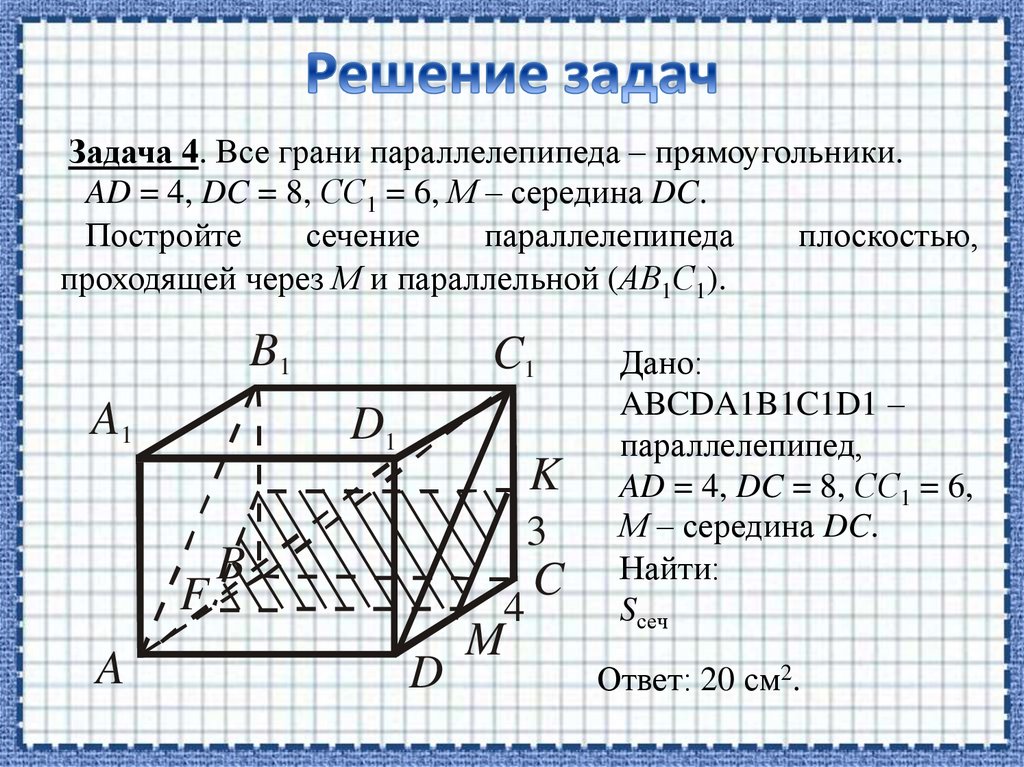 Задача 4. Все грани параллелепипеда – прямоугольники.AD = 4, DC = 8, СС1 = 6, М – середина DC.