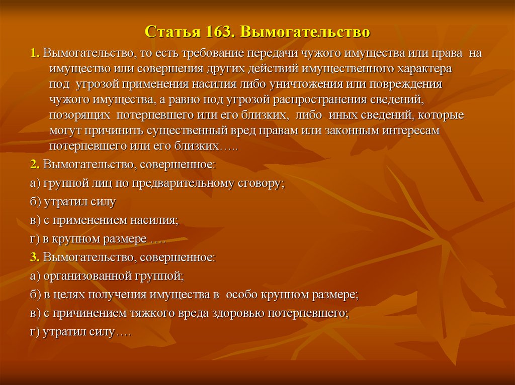 Статья 163. Вымогательство1. Вымогательство, то есть требование передачи чужого имущества или права на