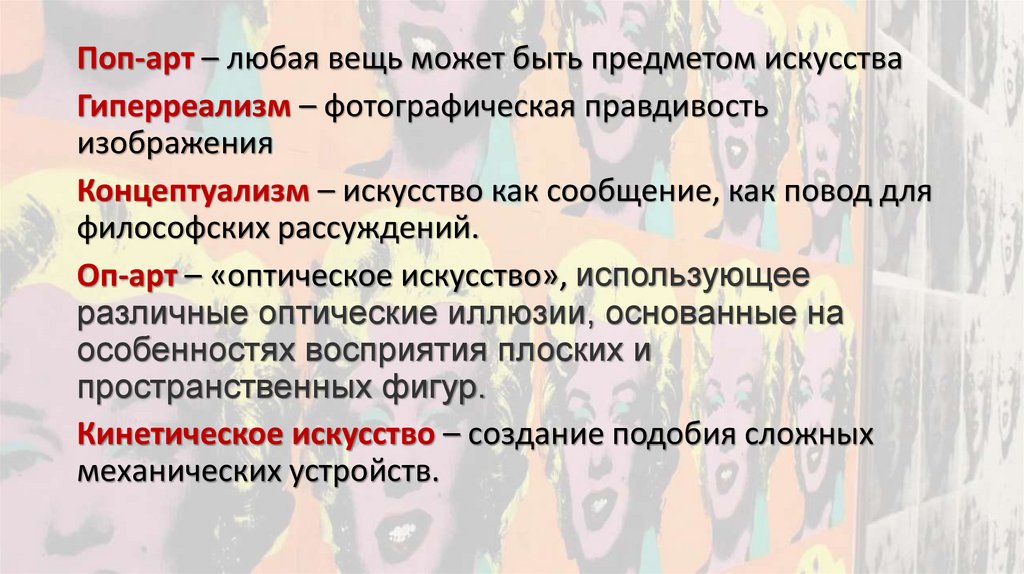 Поп-арт – любая вещь может быть предметом искусстваГиперреализм – фотографическая правдивость
