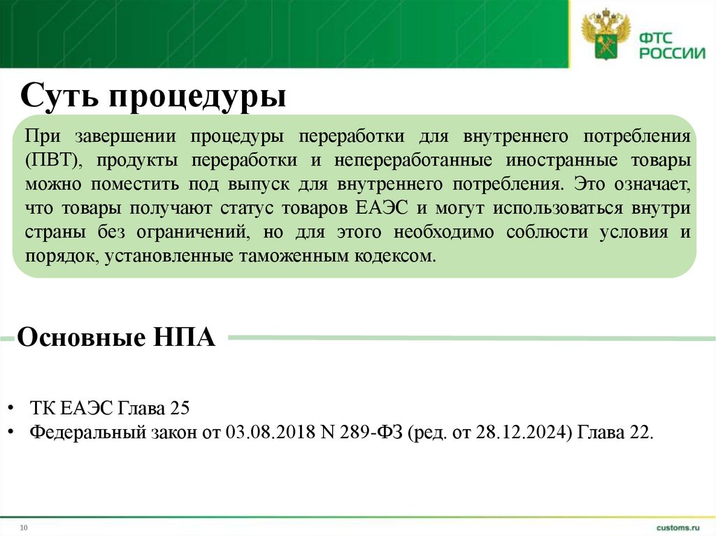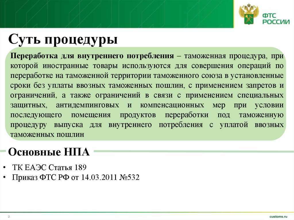 Суть процедурыПереработка для внутреннего потребления – таможенная процедура, при