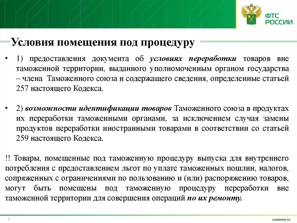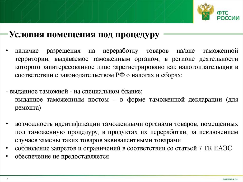 Условия помещения под процедуру• 1) предоставления документа об условиях переработки товаров вне
