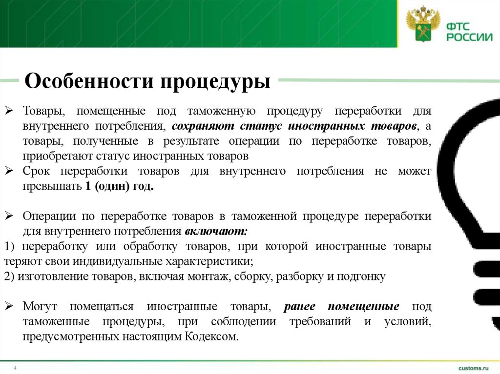 Особенности процедурыТовары, помещенные под таможенную процедуру переработки для