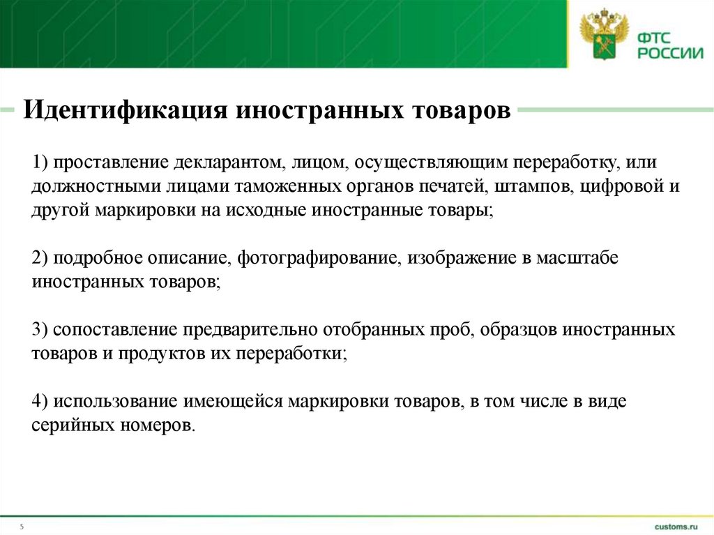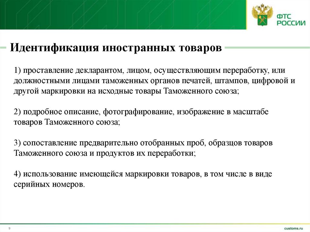 Идентификация иностранных товаров1) проставление декларантом, лицом, осуществляющим переработку, или