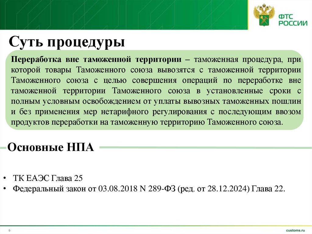Суть процедурыПереработка вне таможенной территории – таможенная процедура, при