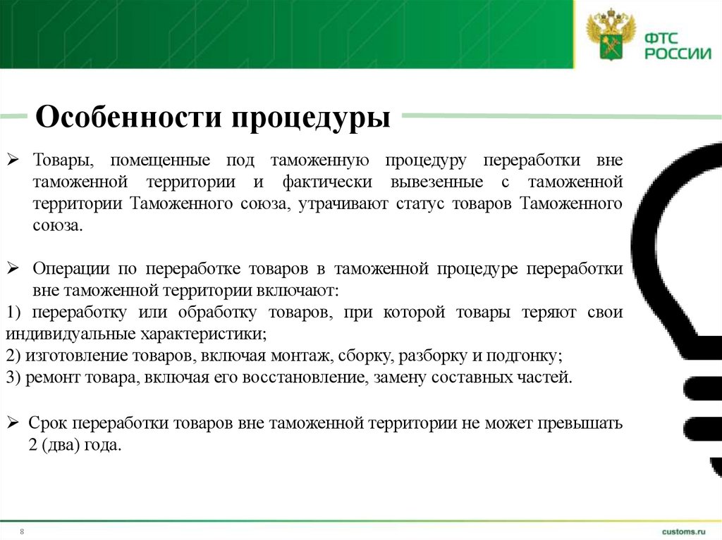 Особенности процедурыТовары, помещенные под таможенную процедуру переработки вне