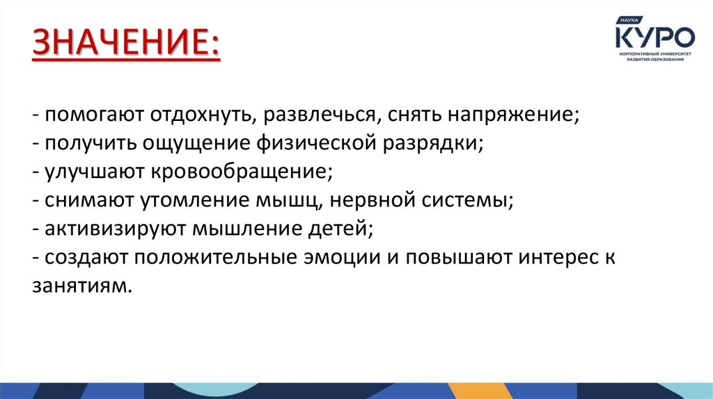 ЗНАЧЕНИЕ:- помогают отдохнуть, развлечься, снять напряжение;