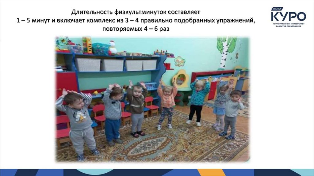 Длительность физкультминуток составляет1 – 5 минут и включает комплекс из 3 – 4 правильно подобранных упражнений,