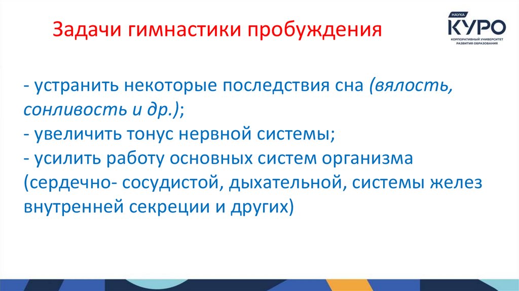 Задачи гимнастики пробуждения- устранить некоторые последствия сна (вялость,