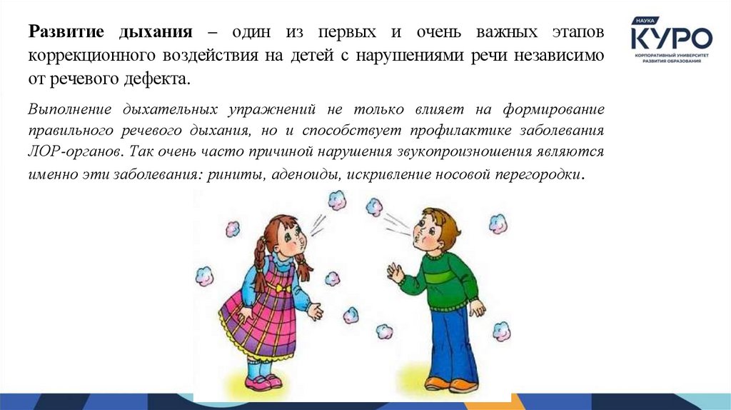Развитие дыхания – один из первых и очень важных этаповкоррекционного воздействия на детей с нарушениями речи независимо
