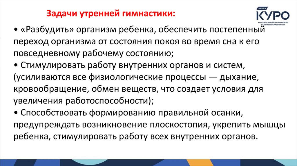 Задачи утренней гимнастики:• «Разбудить» организм ребенка, обеспечить постепенный