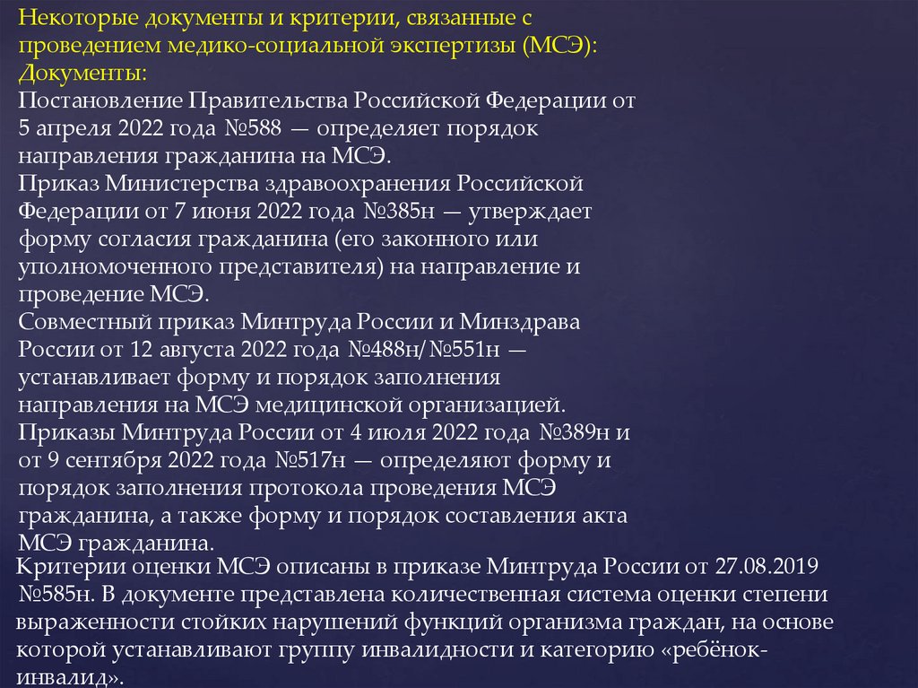 Некоторые документы и критерии, связанные спроведением медико-социальной экспертизы (МСЭ):