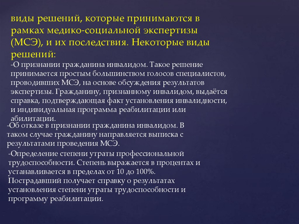 виды решений, которые принимаются врамках медико-социальной экспертизы