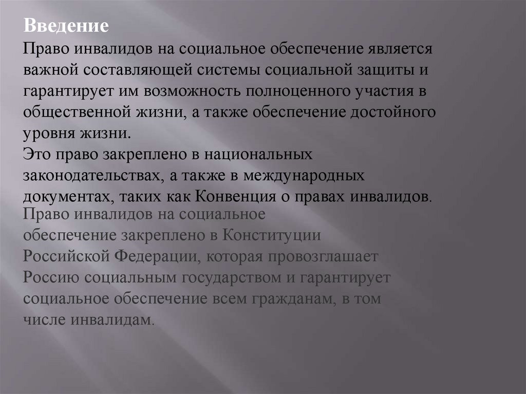 ВведениеПраво инвалидов на социальное обеспечение является