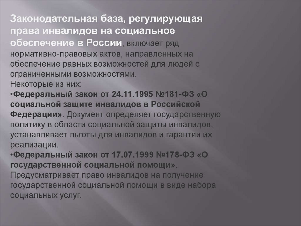 Законодательная база, регулирующаяправа инвалидов на социальное