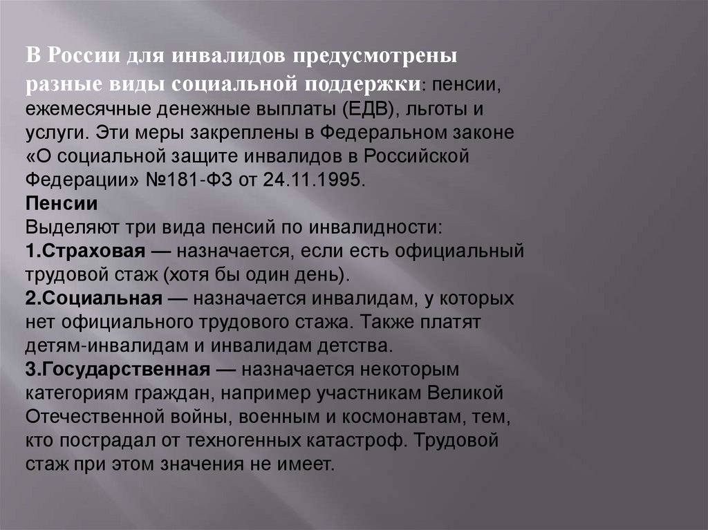 В России для инвалидов предусмотреныразные виды социальной поддержки: пенсии,