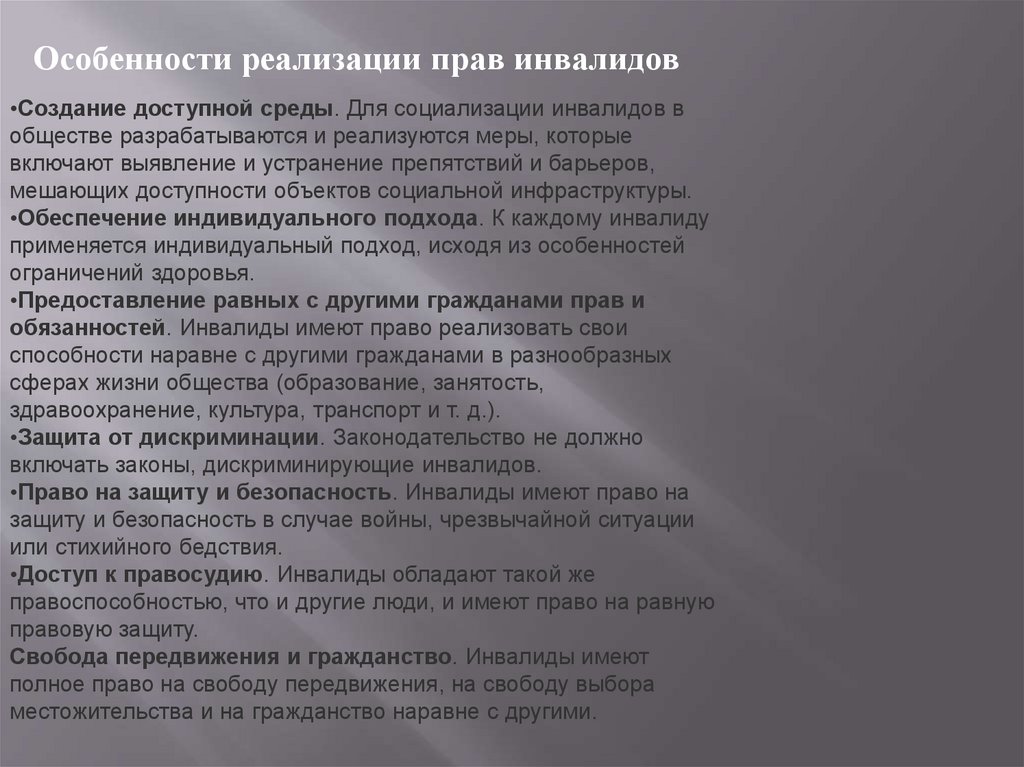 Особенности реализации прав инвалидов•Создание доступной среды. Для социализации инвалидов в