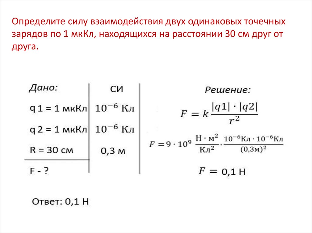 Определите силу взаимодействия двух одинаковых точечныхзарядов по 1 мкКл, находящихся на расстоянии 30 см друг от