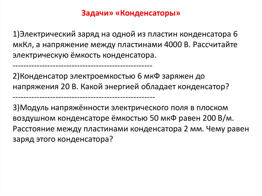 Задачи» «Конденсаторы»1)Электрический заряд на одной из пластин конденсатора 6