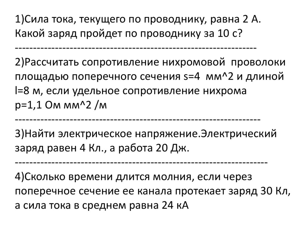 1)Сила тока, текущего по проводнику, равна 2 А.Какой заряд пройдет по проводнику за 10 с?