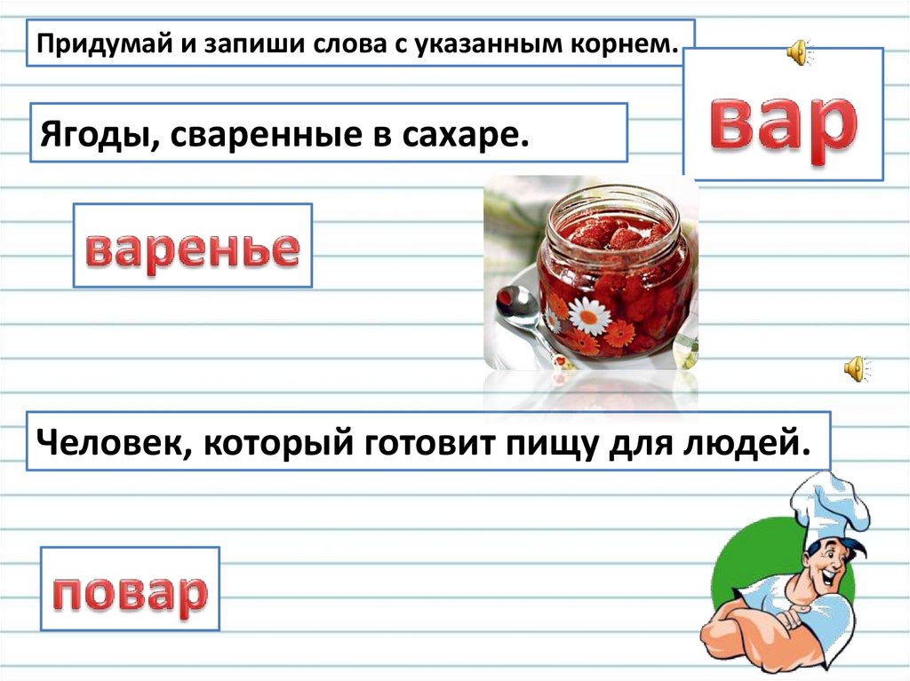 Придумай и запиши слова с указанным корнем.Ягоды, сваренные в сахаре.