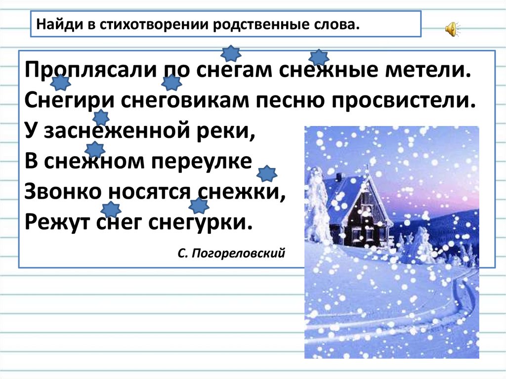 Найди в стихотворении родственные слова.Проплясали по снегам снежные метели.