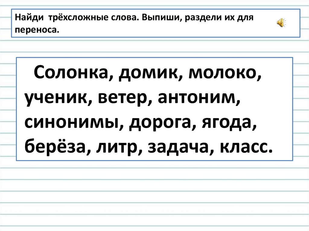 Найди трёхсложные слова. Выпиши, раздели их дляпереноса.