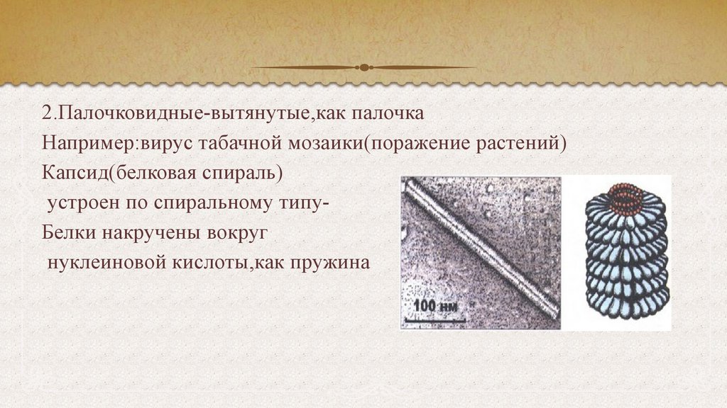 2.Палочковидные-вытянутые,как палочкаНапример:вирус табачной мозаики(поражение растений)